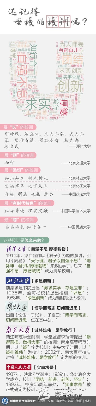 一份對100多所中國高等學(xué)府校訓(xùn)的統(tǒng)計(jì)顯示,出現(xiàn)頻次最高的詞是“求實(shí)”,其次是“創(chuàng)新”、“博學(xué)”、“厚德”,一個‘實(shí)’字始終貫穿于不同時代、不同環(huán)境的校訓(xùn)之中。