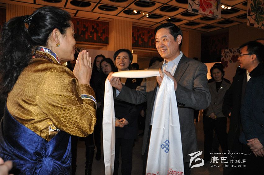 穆黎代表甘孜州婦聯(lián)向劉奇葆獻上藏繡哈達。