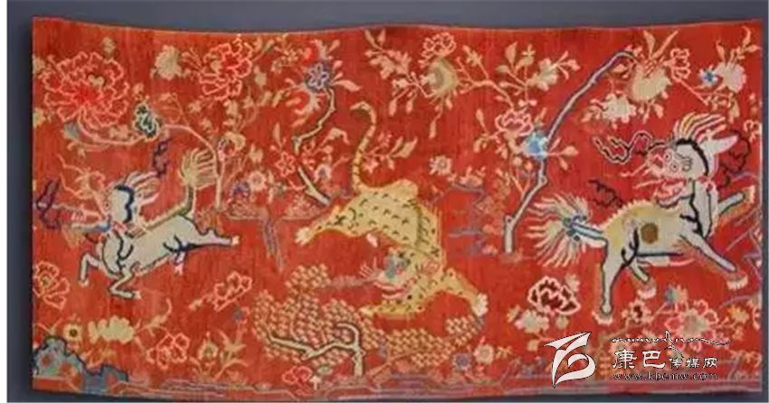 織制有麒麟、老虎和獅子的彩色掛毯寓意著福、祿、壽,是從前達(dá)官顯貴們重要家裝飾品之一。此掛毯上的動物與花朵造型古樸,雖然已歷經(jīng)歲月,然而色澤依舊鮮艷如初。