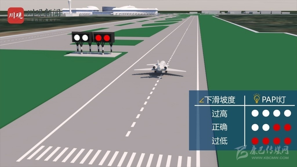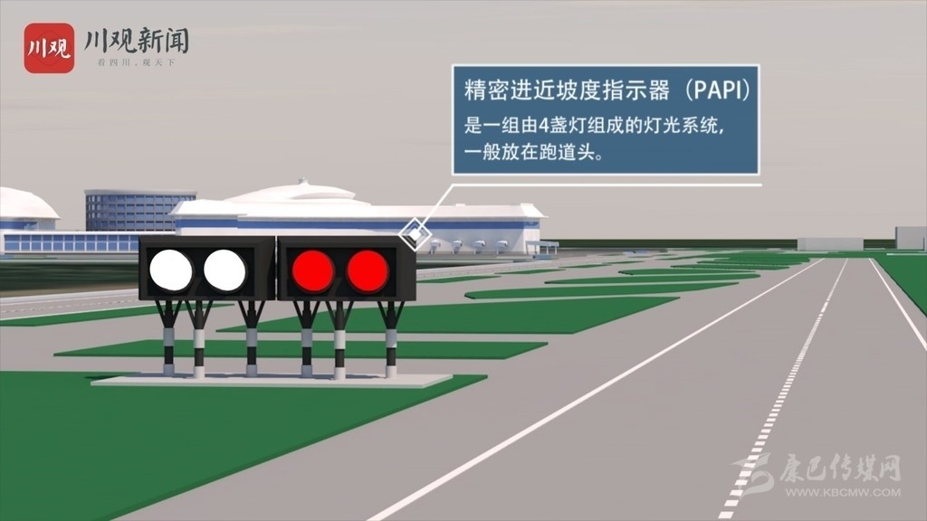 緊密進近坡度指示器(PAPI),是一組由4盞燈組成的燈光系統(tǒng),一般放在跑道頭。飛行員從空中觀察,如果高于預(yù)定下滑道,PAPI燈顯示全白,反之則顯示全紅。飛行員如果看到兩紅兩白的PAPI燈,就說明飛機下滑坡度正確,能夠安全降落。