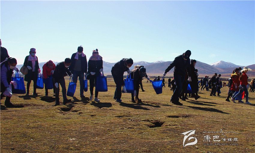 5月11日,距石渠縣城約5公里處的草原上人聲鼎沸,格外熱鬧。一大早,來自各單位的300余名黨員干部便聚集到了這里,身穿紅背心的青年志愿者們正忙著為大家分發(fā)口罩、手套等勞動物品。而在人群最前端,一輛拖拉機滿載著一車類似飼料的東西,七八個人正有條不紊地將“飼料”卸車并分裝進數百個藍色環(huán)保袋中。