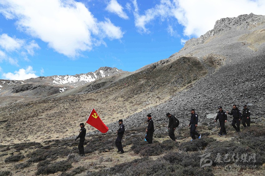為確保蟲草采挖期間的社會治安穩(wěn)定,縣公安局抽調精干力量,前往哈幾山、莫庫溝等多個蟲草采挖點開展巡山維穩(wěn)。這次和我們一起開展常規(guī)巡邏的共有8名公安干警。降初是本地人,1.78米的個子,一路上,他高舉黨旗、步履矯健、勇往直前,成為我們大家的“領路人”,大家經常和他開玩笑說:“跟著黨(旗)走永遠不迷路”。