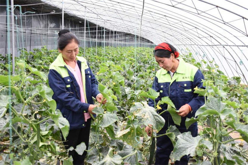 格絨青措(右)和阿佳(左)正在蔬菜大棚里管護黃瓜苗。