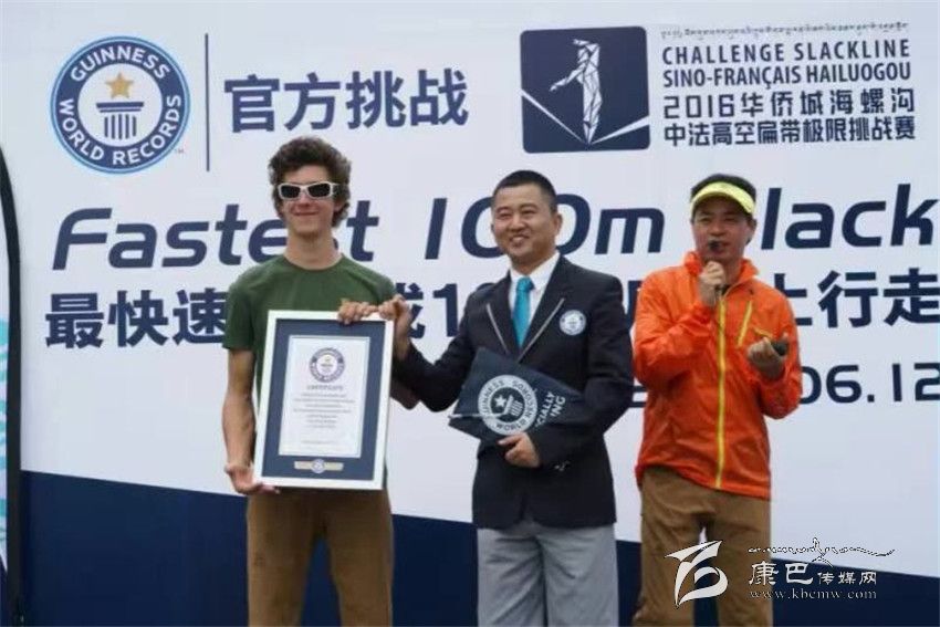 6月11日“2016華僑城海螺溝高空扁帶極限挑戰(zhàn)賽”上,法國選手Nathan Paulin以零失誤的成績成功完成了海拔3600米、長度820米高空扁帶極限挑戰(zhàn),完成了一次驚艷視覺、顛覆想象、燃爆心跳的極限之旅,創(chuàng)造了世界最高海拔,最長距離的高空扁帶運(yùn)動的東方奇跡,被譽(yù)為“北緯30°的云端行走”。次日,法國選手Lucas Milliard在海螺溝大橋下以1分59秒73的成績創(chuàng)造了最快速度完成100米扁帶上行走吉尼斯世界紀(jì)錄,成為這項吉尼斯世界紀(jì)錄的締造者。從此,他的名字隨著中國四川甘孜海螺溝一起被整個世界所記錄。