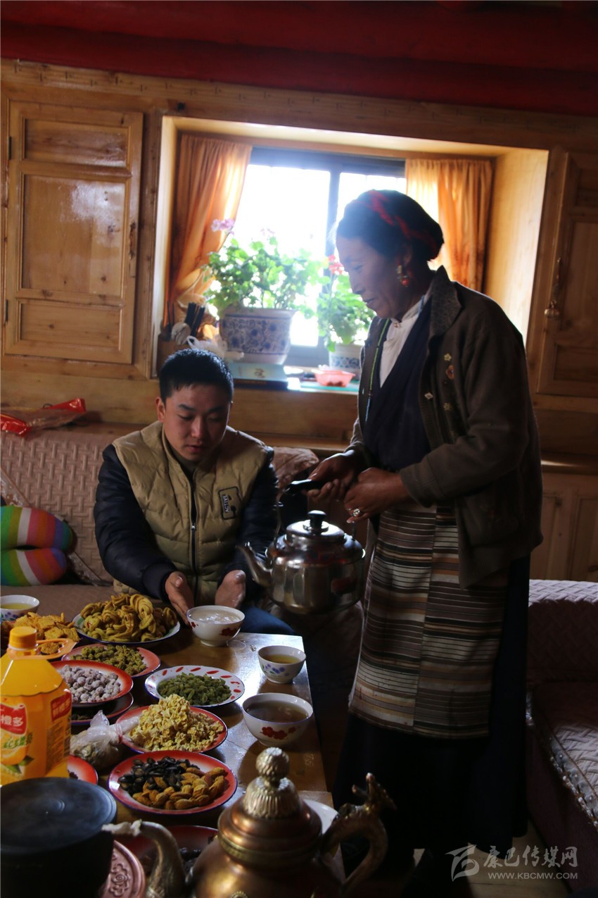 國道350線旁,一扇鐵門輕掩蓋,門內飄來陣陣肉香;幾聲犬吠過后,一名穿戴整潔的藏族婦女走了出來;隨行的村支部書記澤吉告訴記者這就是曲珍,今年計劃脫貧的貧困戶。跟隨曲珍走進一間房屋,出現在記者眼前的是一個藏漢風格結合的客廳:地面和天花板都由光亮的木質建材裝飾,對門的墻面上有一個木質展示架,架上規(guī)整地陳列著仿真鮮花、盆景、瓷質茶杯和高腳杯。要不是架上還放著幾個藏式茶壺和旁邊的藏桌、藏床,記者還以為是走進了一個漢族城市家庭的客廳。
