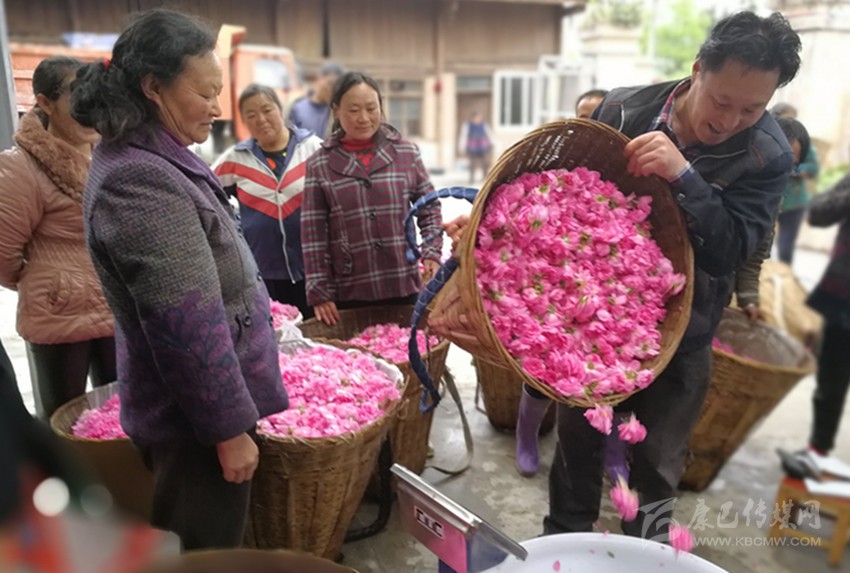 16日上午,小雨停了下來,趕在太陽出來之前采摘的玫瑰花出油率好,是采摘的黃金時間。在燕子溝鎮(zhèn)新龍門子村生產(chǎn)加工點,周邊農(nóng)戶將采摘的粉色玫瑰花瓣過秤,逐筐倒進(jìn)特定的堆放地點,農(nóng)戶們也收到了應(yīng)得的勞務(wù)收入,空氣中彌漫著一股玫瑰花特有的芳香和浪漫,也充滿了當(dāng)?shù)匕傩招腋:吞鹈鄣奈兜馈?/span>